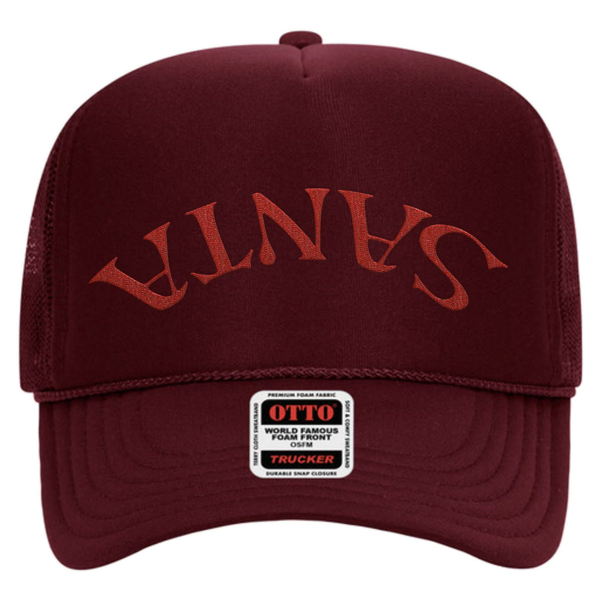 SANTA embroidered in red, upside down on a burgundy snapback trucker hat.
